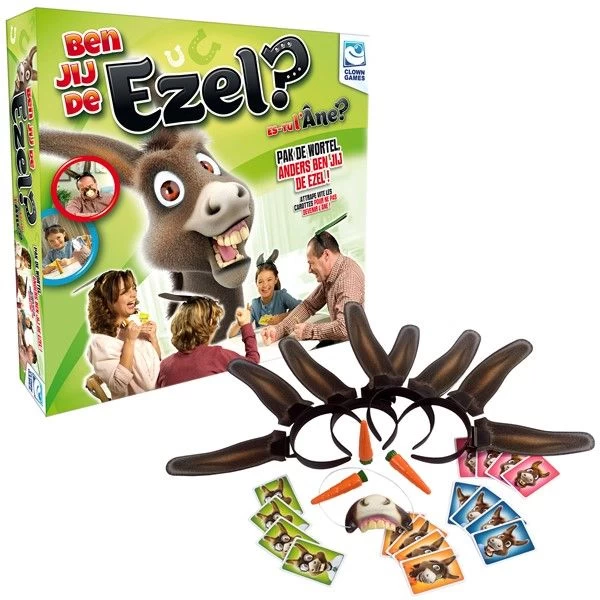 Bij dit grappige spel draait het om snelheid! Niemand wil de ezel zijn! Zet de 3 wortels rechtop op tafel. Nu moet je steeds een kaartje ruilen met je tegenspelers. Verzamel zo snel mogelijk 4 kaartjes van dezelfde kleur. Als je 4 dezelfde kaartjes hebt, roep je Ezel! Pak dan snel een wortel. Er zijn er maar3, dus de speler zonder wortel is de ezel! Hij moet 1 ezelsoor rechtop zetten. De speler, die als eerste twee oren omhoog heeft staan is de EZEL en krijgt de ezelsnuit.