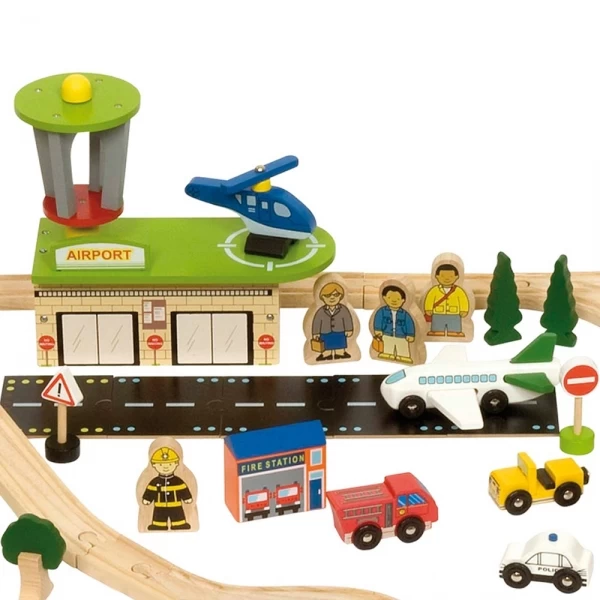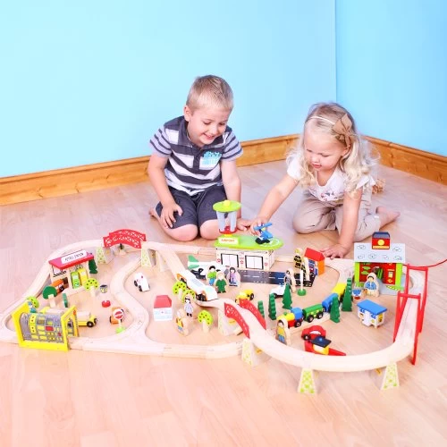 Treinen, vliegtuigen en motorvoertuigen komen allemaal samen in deze uitgebreide houten transporttreinset die elke speelsessie ongelooflijk veel variatie brengt. Ontworpen om de slimste jonge geesten op te leiden en te stimuleren. Bevat een helihaven, boot, benzinestation, ziekenhuis en wasplaats voor locomotieven. Zie hoe de fantasie van uw kind op hol slaat terwijl ze steeds meer opgaan in de eindeloze scenario’s die ze kunnen creëren. Bestaat uit 122 speelstukken. Er zijn extra accessoires verkrijgbaar om deze set uit te breiden. De meeste andere grote merken houten spoorwegen zijn compatibel met Bigjigs Rail. Gemaakt van hoogwaardige, verantwoorde materialen. Voldoet aan de huidige Europese veiligheidsnormen.