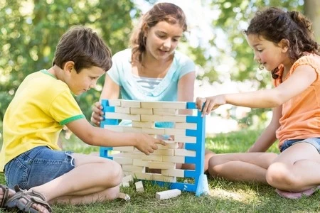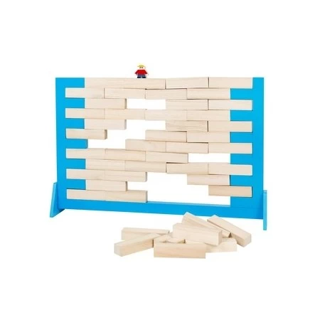 Haal om de beurt een steen uit de muur, maar laat de meneer niet van de muur af vallen! Een spannend spel voor jong en oud! Gemaakt van hout.