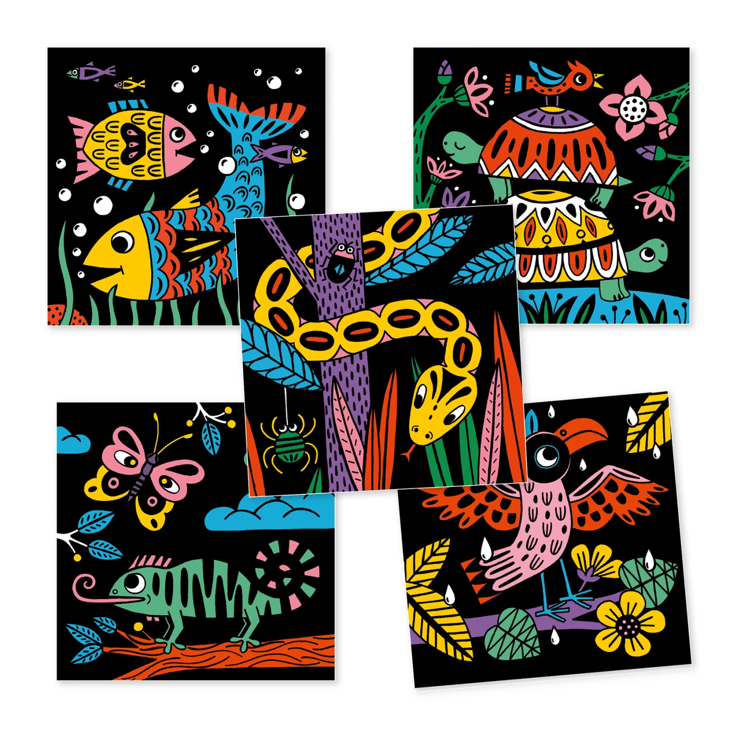 Maak prachtig schilderijtjes met deze bijzondere kleurplaten in het thema “dieren” van Djeco. Kleuren zonder buiten de lijntjes te gaan.