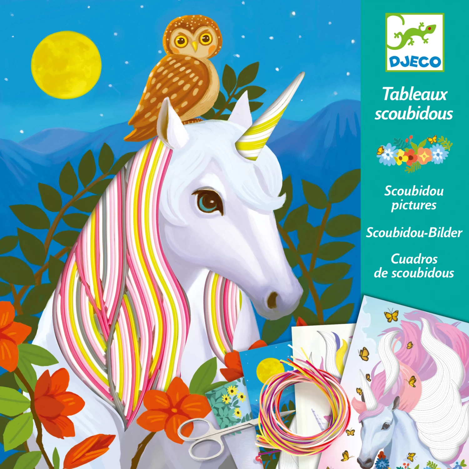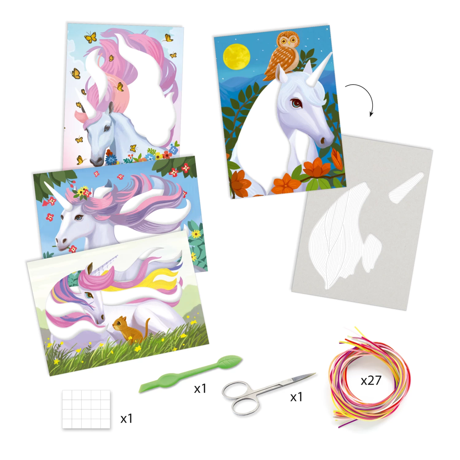 Om deze 4 schilderijtjes te maken, haalt het kind de voorgelijmde gebieden met behulp van het gereedschap tevoorschijn en lijnt vervolgens de gekleurde scoubidou draden uit door de golving van de indicatieve lijnen te volgen. De kleurrijke manen van de eenhoorns komen dan ogenschijnlijk in beweging. Vervolgens wordt over de ondergrond met de aangebrachte scoubidoudraadjes een open gewerkte, zelfklevende bovenlaag aangebracht. Dit maakt het eindresultaat helemaal af.