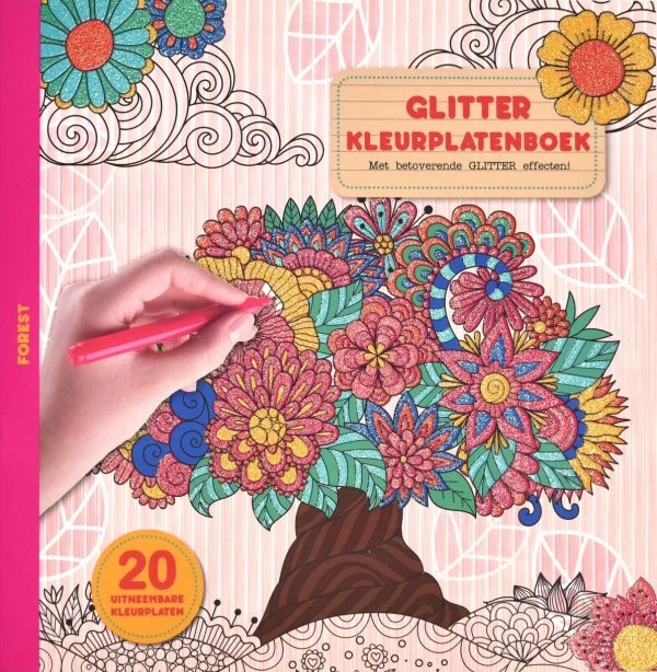 Het glitter kleurplaten boek bevat 20 uitneembare kleurplaten vanhet bos met zijn bosdieren.