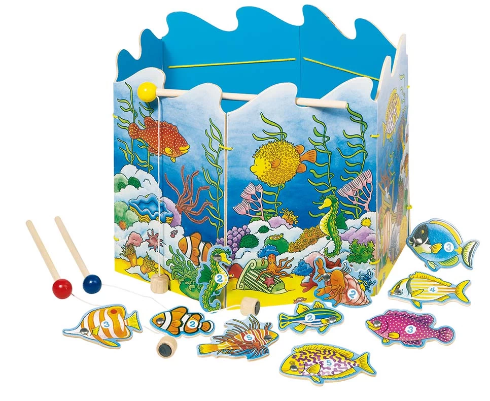 19-delig houten visspel. Probeer zoveel mogelijk vissen te vangen en daarbij ook nog eens veel punten te scoren. Om te winnen is nl. niet alleen het aantal opgeviste items doorslagevend, omdat alle vissen, laarzen en zeesterren staan voor verschillende aantallen in punten.