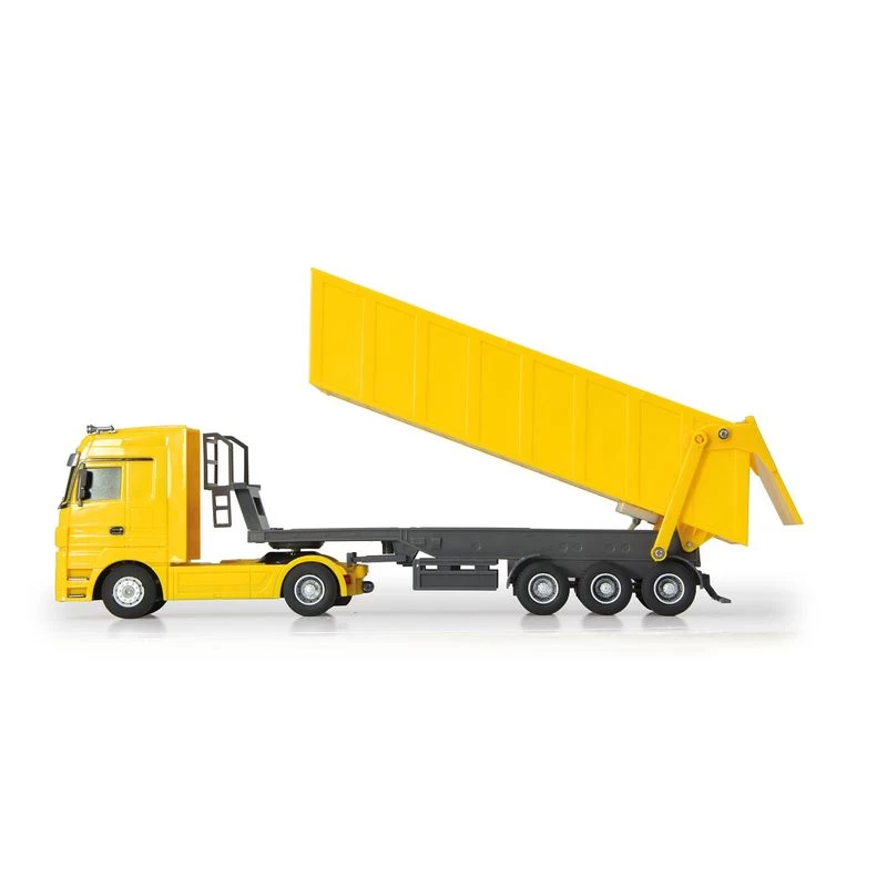 Op afstand bestuurbare Mercedes-Benz Actros vrachtwagen met oplegger. De truck maakt echt motorgeluid tijdens het rijden en geeft een signaal bij achteruit rijden. Voorzien van LED verlichting voor het rijden in het donker. Trailer lossen en ontkoppelen met de afstandsbediening. Besturing: 40 Mhz.