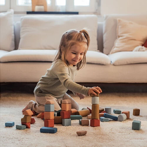 De speelblokken hebben afgeronde hoeken en een natuurlijk ruw oppervlak waardoor de stenen fijn aanvoelen en meer grip hebben. Ze stapelen dus eenvoudiger.