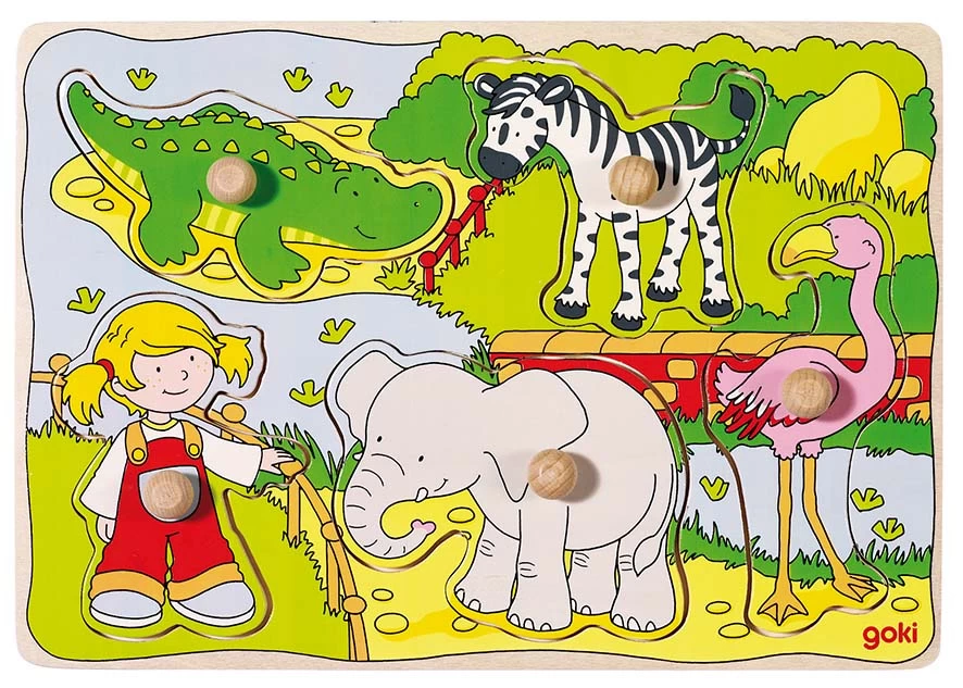 Kleurige houten noppenpuzzel met 5 puzzelstukken.