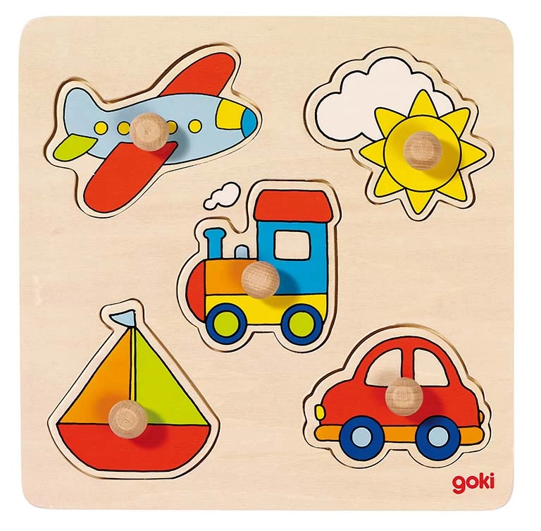 Houten noppenpuzzel met 5 puzzelstukken in de vorm van voertuigen.