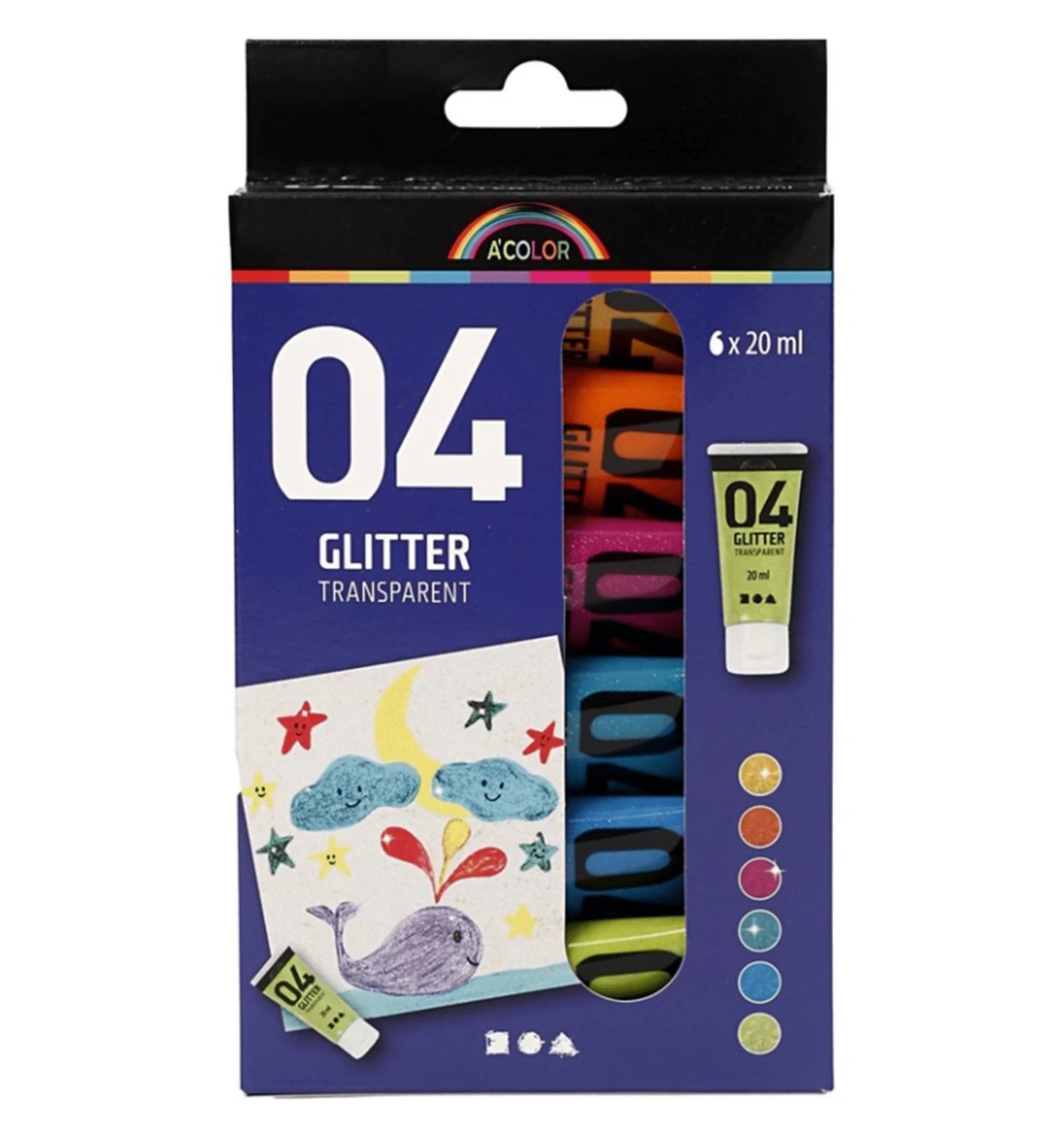Plakkaatverf set Acrylverf Glitter Secundaire kleuren 6 x 20 ml. Betreft een hoge kwaliteit dekkende allround plakkaatverf op waterbasis. De kwasten moeten worden schoongemaakt met lauwwarm water. Geschikt voor op gips, papier, papier-mache, hout, enz. Laat eventuele vlekken niet opdrogen maar verwijder direct met koud water en zeep.