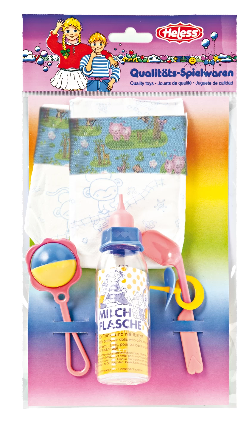 Leuke poppenverzorgingsset bestaande uit 2 luiers, voor poppen 28 – 35 cm., een flesje, lepel, speen en rammelaar.